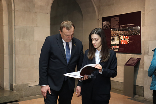 Հյուրերին դիմավորեց Հայոց ցեղասպանության թանգարան-ինստիտուտի թանգարանային աշխատանքների գծով փոխտնօրեն Լուսինե Աբրահամյանը: Նա հյուրերին ուղեկցեց դեպի Հայոց ցեղասպանության հուշահամալիր՝ ներկայացնելով հուշահամալիրի ստեղծման պատմությունը: ՀՑԹԻ փոխտնօրենն անդրադարձ կատարեց նաև Ծիծեռնակաբերդի տարածքում անցյալ դարավերջին Ադրբեջանի Սումգայիթ, Կիրովաբադ (Գանձակ), Բաքու քաղաքներում ադրբեջանական կառավարության կազմակերպած կոտորածներին զոհ գնացած հայերի հիշատակին տեղադրված երեք խաչքարերի և Արցախյան գոյամարտի տարիներին Հուշապատի դիմացի հատվածում հուղարկավորված հինգ ազատամարտիկների պատմություններին՝ շեշտելով կապը տեղի ունեցածի և Հայոց ցեղասպանության միջև: