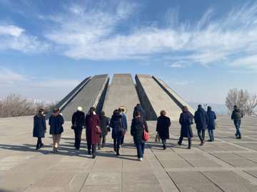 Հյուրերին դիմավորեց Հայոց ցեղասպանության թանգարան-ինստիտուտի թանգարանային աշխատանքների գծով փոխտնօրեն Լուսինե Աբրահամյանը: Նա հյուրերին ուղեկցեց դեպի Հայոց ցեղասպանության հուշահամալիր՝ ներկայացնելով հուշահամալիրի ստեղծման պատմությունը: ՀՑԹԻ փոխտնօրենն անդրադարձ կատարեց նաև Ծիծեռնակաբերդի տարածքում անցյալ դարավերջին Ադրբեջանի Սումգայիթ, Կիրովաբադ (Գանձակ), Բաքու քաղաքներում ադրբեջանական կառավարության կազմակերպած կոտորածներին զոհ գնացած հայերի հիշատակին տեղադրված երեք խաչքարերի և Արցախյան գոյամարտի տարիներին Հուշապատի դիմացի հատվածում հուղարկավորված հինգ ազատամարտիկների պատմություններին՝ շեշտելով կապը տեղի ունեցածի և Հայոց ցեղասպանության միջև: