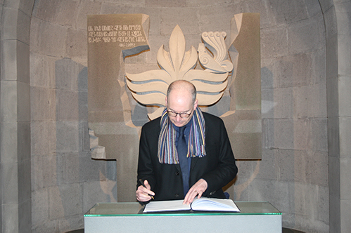 Պարոն Նիլս Անենը ծաղկեպսակ դրեց Հայոց ցեղասպանության զոհերի հիշատակը հավերժացնող հուշակոթողին, այնուհետև հյուրերը ծաղիկներ դրեցին անմար կրակի մոտ և մեկ րոպե լռությամբ հարգեցին Հայոց ցեղասպանության անմեղ զոհերի հիշատակը: Էդիտա Գզոյանը հյուրերին ուղեկցեց Հուշապատի մոտ, որի հետնամասում հատուկ խորշերի մեջ ամփոփված են 19-րդ դարավերջին և 20-րդ դարասկզբին թուրքական կառավարության իրագործած հայերի զանգվածային կոտորածների և ցեղասպանության դեմ իրենց բողոքի ձայնը բարձրացրած օտարազգի մի շարք հասարակական, քաղաքական գործիչների, մտավորականների և միսիոներների գերեզմաններից վերցված հողով լի փոքր սափորները: Հյուրերը մեծ հետաքրքրությամբ լսեցին հատկապես գերմանացիներ Յոհաննես Լեփսիուսի և Արմին Վեգների հայանպաստ գործունեության մասին: