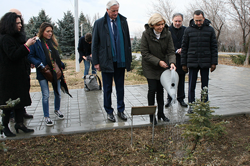 Այցի ավարտին տիկին Վալերի Պեկրեսը շրջեց Հիշողության պուրակում և ջրեց 2018 թ. իր տնկած արծաթափայլ եղևնին: