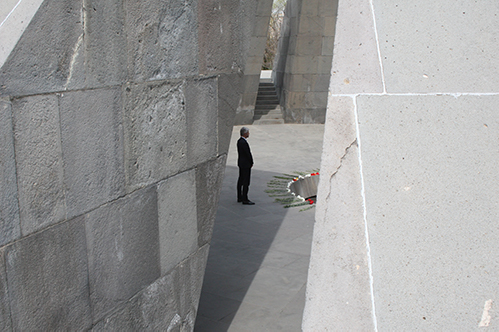 Պարոն Լորան Վոքիեն ծաղկեպսակ դրեց Հայոց ցեղասպանության զոհերի հիշատակը հավերժացնող հուշակոթողին, այնուհետև հյուրերը ծաղիկներ դրեցին անմար կրակի մոտ և մեկ րոպե լռությամբ հարգեցին Հայոց ցեղասպանության անմեղ զոհերի հիշատակը: