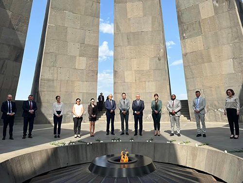 During their visit, members of the delegation laid wreaths at the Memorial to the Victims of the Armenian Genocide and placed flowers at the Eternal Fire, observing a minute of silence in honor of the innocent victims of the genocide. They were then led through the Armenian Genocide Museum's permanent and temporary exhibitions by AGMI Director, after which they inscribed their thoughts in the Memory Book for Honored Guests.
