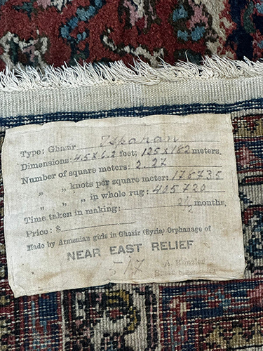 The carpet features a floral composition framed by five borders, incorporating decorative elements rooted in the traditions of the Isfahan school. It was woven in 1923 at a carpet-weaving factory established within the American orphanage in the Near East. Over a six-year period (1923–1929), this factory produced more than 3,200 carpets. The initiative to create the factory was led by Swiss missionary Jakob Küntzler, the director of the Ghazir Girls’ Orphanage, who was honored with the title “Father of Armenian Orphans” for his dedication to the Armenian cause. The orphan girls affectionately called him “Papa”. The factory’s operations were overseen by Hovhannes Tashdjian, originally from Urfa.