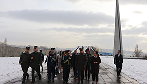 Հյուրերին դիմավորեց Հայոց ցեղասպանության թանգարան-ինստիտուտի թանգարանային աշխատանքների գծով փոխտնօրեն Լուսինե Աբրահամյանը: Նա հյուրերին ուղեկցեց դեպի Հայոց ցեղասպանության հուշահամալիր՝ ներկայացնելով հուշահամալիրի ստեղծման պատմությունը: ՀՑԹԻ փոխտնօրենն անդրադարձ կատարեց նաև Ծիծեռնակաբերդի տարածքում անցյալ դարավերջին Ադրբեջանի Սումգայիթ, Կիրովաբադ (Գանձակ), Բաքու քաղաքներում ադրբեջանական կառավարության կազմակերպած կոտորածներին զոհ գնացած հայերի հիշատակին տեղադրված երեք խաչքարերի և Արցախյան գոյամարտի տարիներին Հուշապատի դիմացի հատվածում հուղարկավորված հինգ ազատամարտիկների պատմություններին՝ շեշտելով կապը տեղի ունեցածի և Հայոց ցեղասպանության միջև: