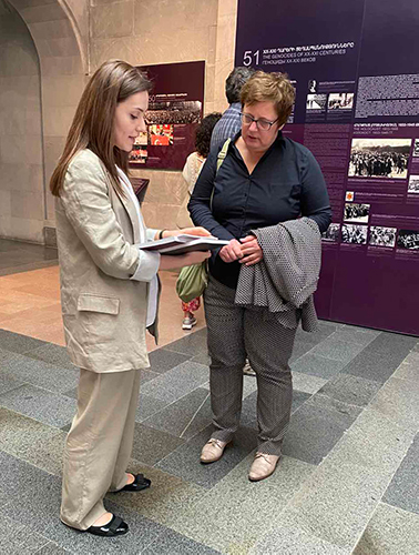 Les invités ont été accueillis par Lusine Abrahamyan, directrice adjointe des affaires muséales du Musée-Institut du génocide des Arméniens. Elle les a accompagnés au Mémorial et a présenté l'histoire de sa création. La directrice adjointe du MIGA a également évoqué les trois khatchkars installés sur le territoire de Tsitsernakaberde à la mémoire des Arméniens victimes des massacres perpétrés par le gouvernement azerbaïdjanais dans les villes de Soumgaït, Kirovabad (Gandzak) et Bakou à la fin du siècle dernier, ainsi que l'histoire des cinq combattants enterrés devant le Mémorial pendant la guerre d'Artsakh, soulignant le lien entre ces événements et le génocide des Arméniens.