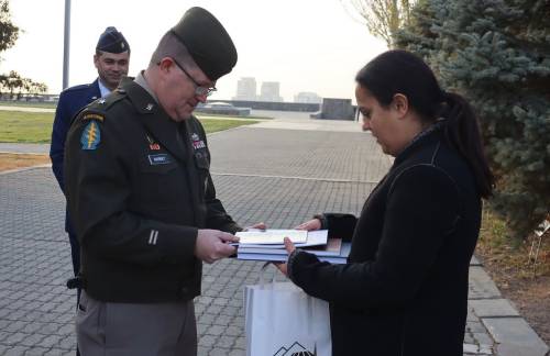 Ziyaret için teşekkür eden ESME Müdürü Edita Gzoyan, General Chris McKinney'e Ermeni Soykırımı hakkında kitaplar hediye etti.