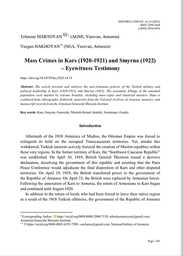 ՀՑԹԻ-ի Հայոց ցեղասպանության զոհերի ու վերապրողների փաստագրման և ուսումնասիրության բաժնի ավագ գիտաշխատող, պ․գ․թ․ Թեհմինե Մարտոյանի և ՀՑԹԻ-ի նախկին ասպիրանտ, պ․գ․թ․ Վազգեն Հախոյանի համահեղինակած “Mass Crimes in Kars (1920-1921) and Smyrna (1922) – Eyewitness Testimony” [Զանգվածային հանցագործություններ Կարսում (1920-1921) և Զմյուռնիայում (1922) – Ականատեսի վկայություններ] հոդվածը հրատարակվել է Historia i Świat պարբերականում (Scopus, Q2)։