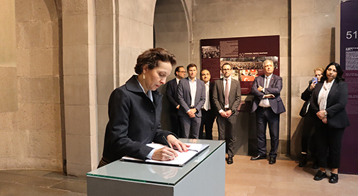 Հյուրերին ողջունեց և այցի ընթացքում ուղեկցեց Հայոց ցեղասպանության թանգարան-ինստիտուտի տնօրենի ժամանակավոր պաշտոնակատար Հրաչյա Թաշչյանը: Տիկին Մարտինա ֆոն Քյունսբերգ-Սարրեն ծաղկեպսակ դրեց Հայոց ցեղասպանության զոհերի հիշատակը հավերժացնող հուշակոթողին, այնուհետև պատվիրակության անդամները ծաղիկներ դրեցին անմար կրակի մոտ և մեկ րոպե լռությամբ հարգեցին Հայոց ցեղասպանության անմեղ զոհերի հիշատակը: Նրանք շրջեցին Հայոց ցեղասպանության թանգարանում, որտեղ ՀՑԹԻ-ի թանգարանային աշխատանքների գծով փոխտնօրեն Լուսինե Աբրահամյանի ուղեկցությամբ ծանոթացան մշտական և ժամանակավոր ցուցադրություններին: Շրջայցի վերջում պատվիրակության անդամները գրառումներ կատարեցին Պատվավոր հյուրերի հուշամատյանում: