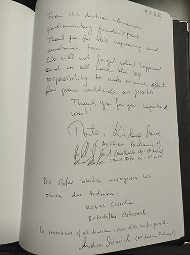 Այսօր Ավստրիայի Հանրապետության խորհրդարանի Ավստրիա-Հայաստան բարեկամական խմբի նախագահ Մարտինա ֆոն Քյունսբերգ-Սարրեի գլխավորած պատվիրակությունն այցելեց Հայոց ցեղասպանության հուշահամալիր՝ ՀՀ-ում Ավստրիայի դեսպան պարոն Ռոբերտ Գերշների ուղեկցությամբ: