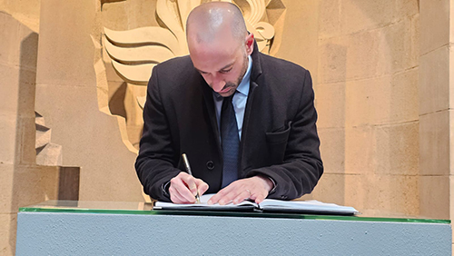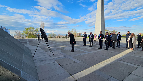 Բենժամեն Հադադը ծաղկեպսակ է դրել հուշահամալիրի պատին, ապա պատվիրակության անդամները ծաղիկներ են դրել անմար կրակի մոտ, մեկ րոպե լռությամբ հարգել Հայոց ցեղասպանության զոհերի հիշատակը: