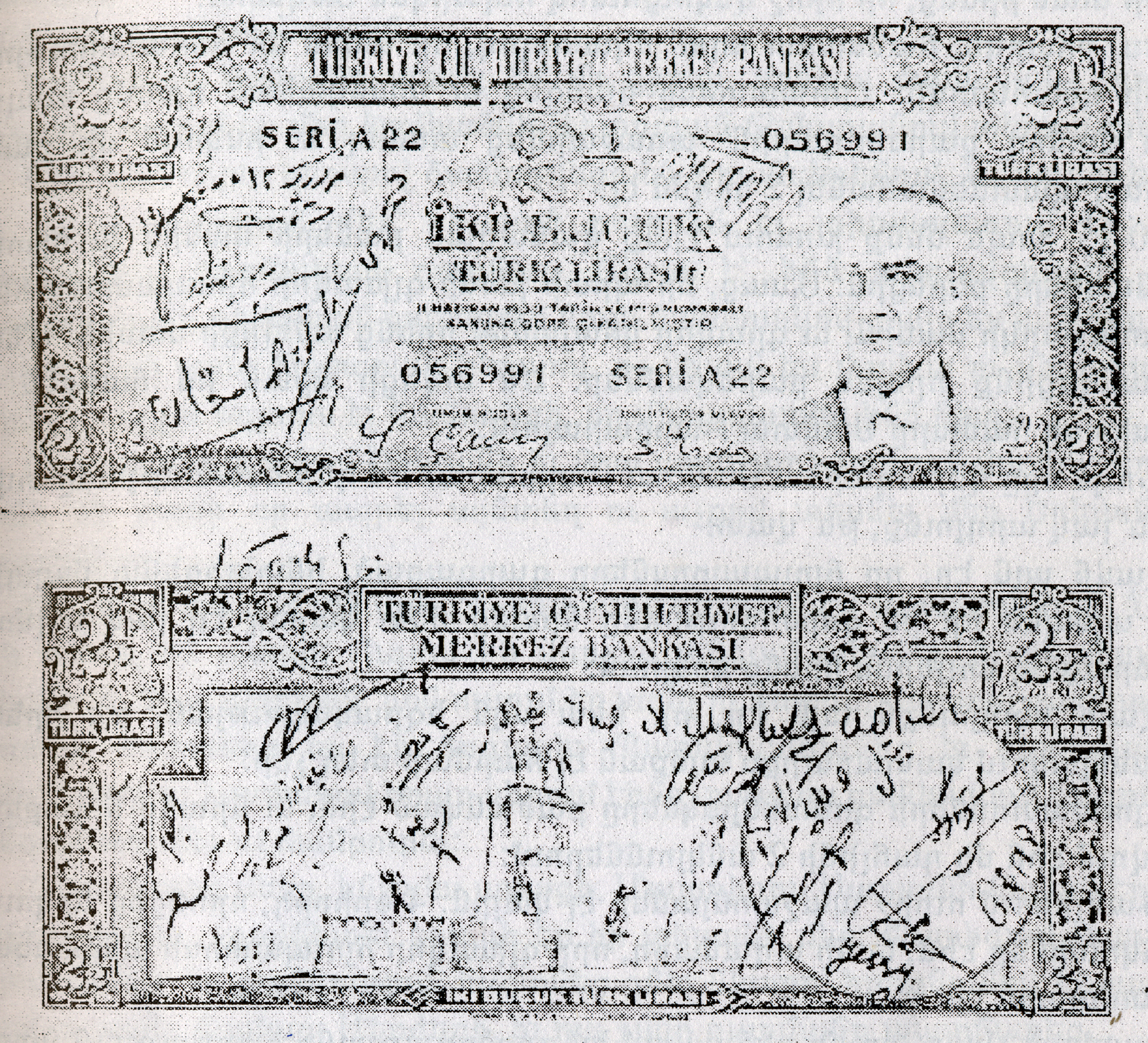 Թուրքական թղթադրամը Իրանի նախկին թագավորի հոր` Ռեզա շահի և մի շարք այլ հայտնի մարդկանց ստորագրություններով