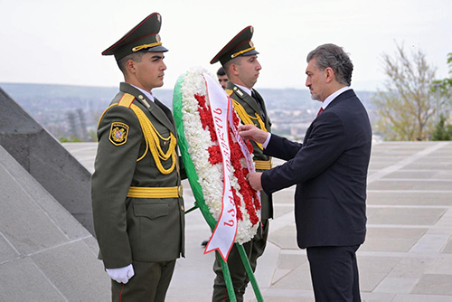 Վրաստանի նախագահը ծաղկեպսակ դրեց Հայոց ցեղասպանության զոհերի հիշատակը հավերժացնող հուշակոթողին, այնուհետև հյուրերը ծաղիկներ դրեցին անմար կրակի մոտ և մեկ րոպե լռությամբ հարգեցին Հայոց ցեղասպանության անմեղ զոհերի հիշատակը: