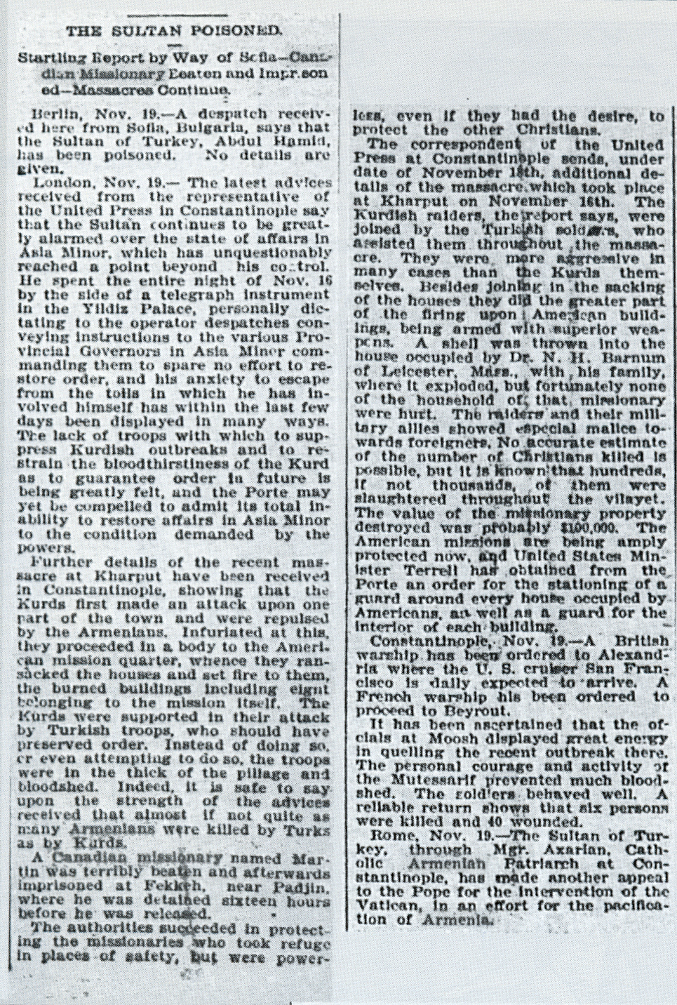 The Globe թերթում լույս տեսավ հոդված՝ Վանի վիլայեթում երկրաշարժից հետո սկսված սովի մասին: Այդ մասին թերթի խմբագրություն նամակ էին ուղարկել նույն թվականի հուլիս ամսին Արևմտյան Հայաստանի Էրզրում քաղաք տեղափոխված միսիոներներ Ռոբերտ և Ուիլյամ Չեմբերսները: Քուինս աստվածաբանական քոլեջի ղեկավար Ջորջ Գրանտին գրված իր նամակում Ռոբերտ Չեմբերսը խնդրում էր տեղեկացնել կանադացիներին Վանի նահանգում քրիստոնյաների ծանր դրության մասին և ֆինանսական օգնություն ուղարկել: Ջ. Գրանտն այդ նամակը տպագրեց