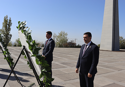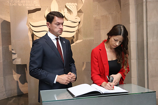Лусине Абрамян представила гостям историю создания мемориального комплекса и сопроводила их к Вечному огню, где они возложили цветы и почтили память жертв минутой молчания.