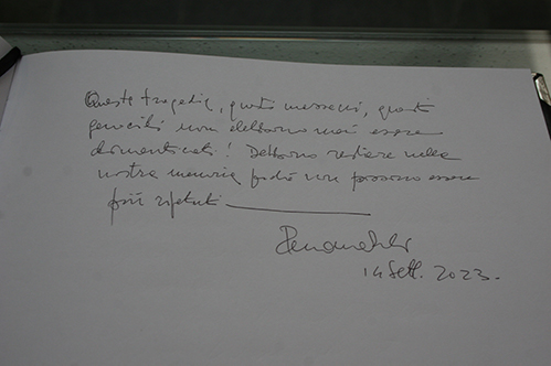 Гости также посетили музей Геноцида армян, где ознакомились с постоянной и временной экспозициями в сопровождении Лусине Абрамян, после чего г-н Романо Проди сделал запись в памятной книге почетных гостей.